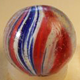 Deze knikker werd in Nederland nog wel eens "Uitje" of "Uienschilletje" genoemd, door de verzamelaar "Onionskin". Anders dan de Joseph Coat heeft de Onionskin een meestal witte en soms gele basis onder de gekleurde lijnen. Ook heeft hij minder kleuren, dan de Joseph Coat. Deze hier is blauw op een witte basis.