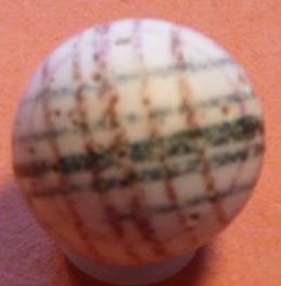 Bodemvondst Overijssel. Grote poseleinen knikker met dubbele lijnen. Helix China, eind vroege periode.
