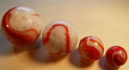 Het grote verschil met z'n voorganger: grotere variatie in diameter. De grootste op deze foto is 2,9 cm, de volgende 2,5 cm, dan de gewone diameter, 1,6 cm en een kleine met een diameter van 1,2 cm. De knikkers met een diameter van 2,5 en 1,2 cm zijn verreweg het zeldzaamst.